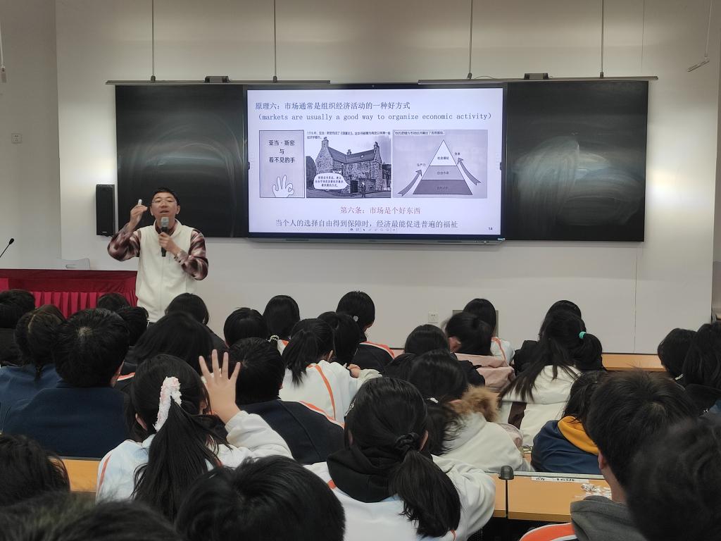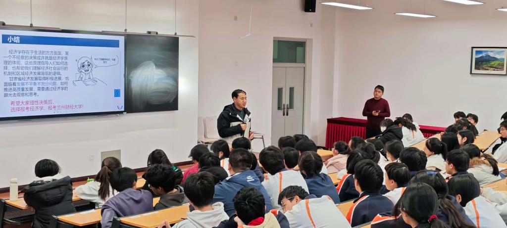 陈润羊教授在两所中学做了《由经济学原理看甘肃省经济发展的成就、挑战与“十五五”前景》的主题报告。首先,他用通俗易懂的案例,结合高中生的实际,介绍了经济学的十大原理,指出经济学始于理解个体如何做出理性选择,进而扩展到人们如何通过贸易实现双赢,并着眼于整体经济的运行规律的理解,这些原理共同构建了一个从个体决策到国家政策的完整分析框架。其次,结合研究经历,分析了甘肃省经济发展取得的积极进展和面临的挑战,提出了“十五五”时期的甘肃省高质量发展的方向和路径。着重强调了如何理解甘肃省发展不平衡不充分问题以及推进高质量发展,都需要通过经济学的眼光去观察和思考。最后,他指出,经济学存在于生活的方方面面,这些经济学原理指导人们如何选择,也帮助我们理解经济社会运行的机制和区域经济发展的逻辑。
