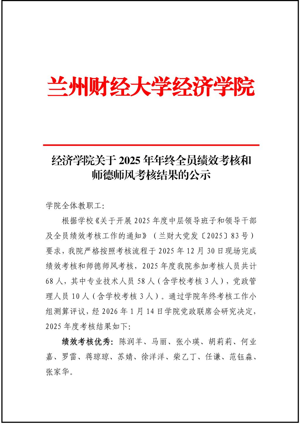 经济学院关于2025年年终全员绩效考核和师德师风考核结果的公示